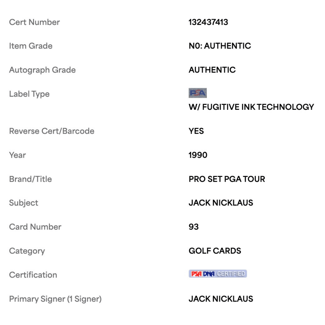 For avid golf collectors and fans of Jack Nicklaus this 1990 PGA Tour Pro Set Card #93 is an absolute gem! The autograph is authenticated by PSA. This pristine piece is a must-have addition to any sports card collection.