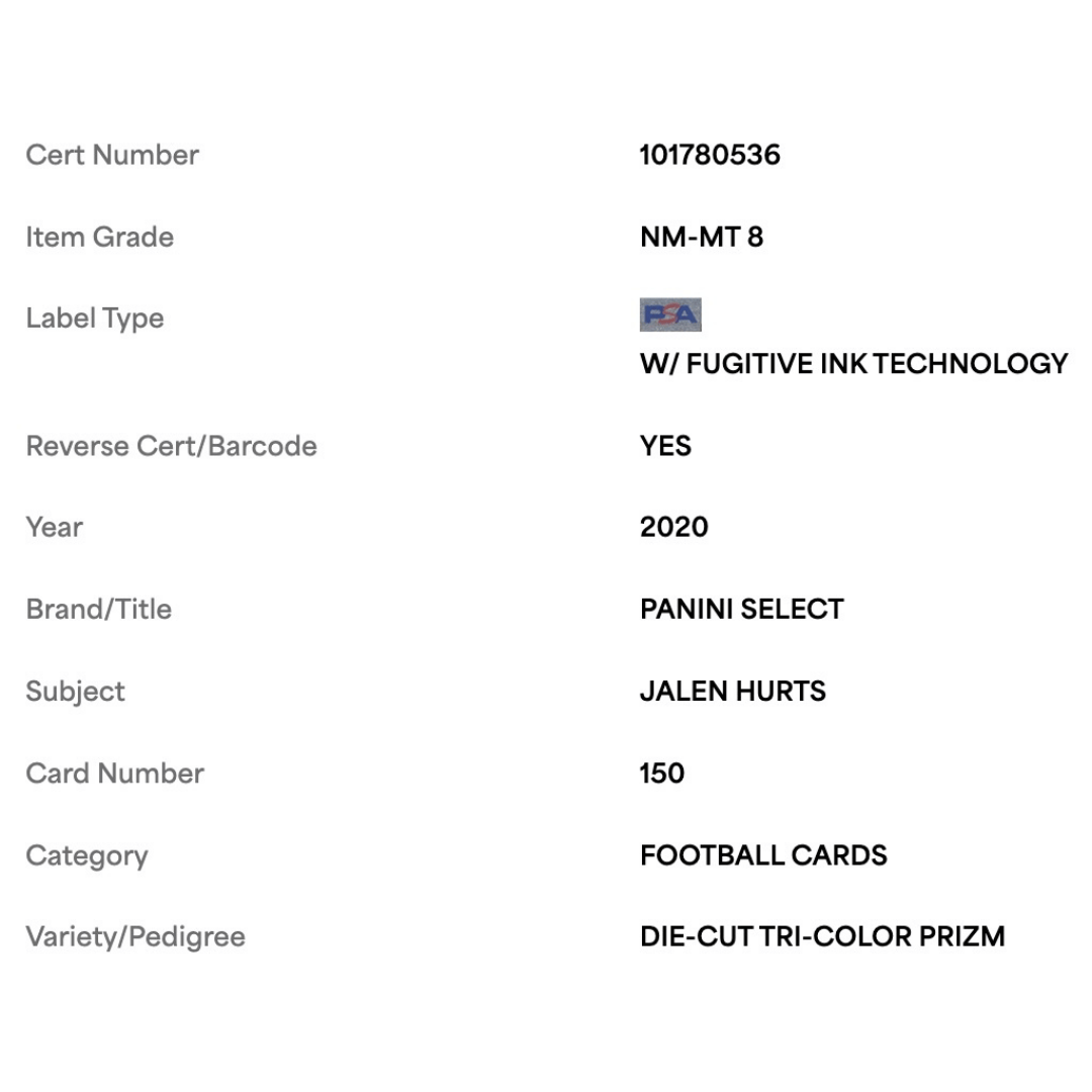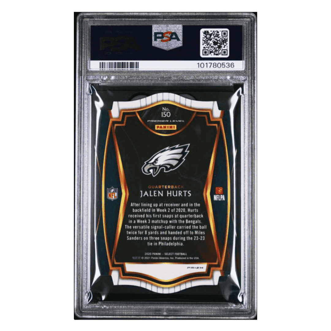 For avid football collectors and fans of Jalen Hurts this 2020 Panini Select Die Cut Tri Color Prizm Rookie RC Card #150 in PSA 8 condition is an absolute gem! This pristine piece is a must-have addition to any sports card collection.