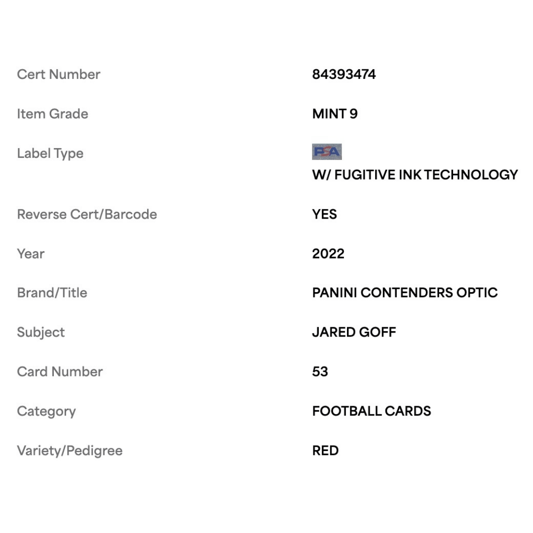 Jared Goff PSA 9 2022 Panini Contenders Optic Red #d/ 175 Card #53