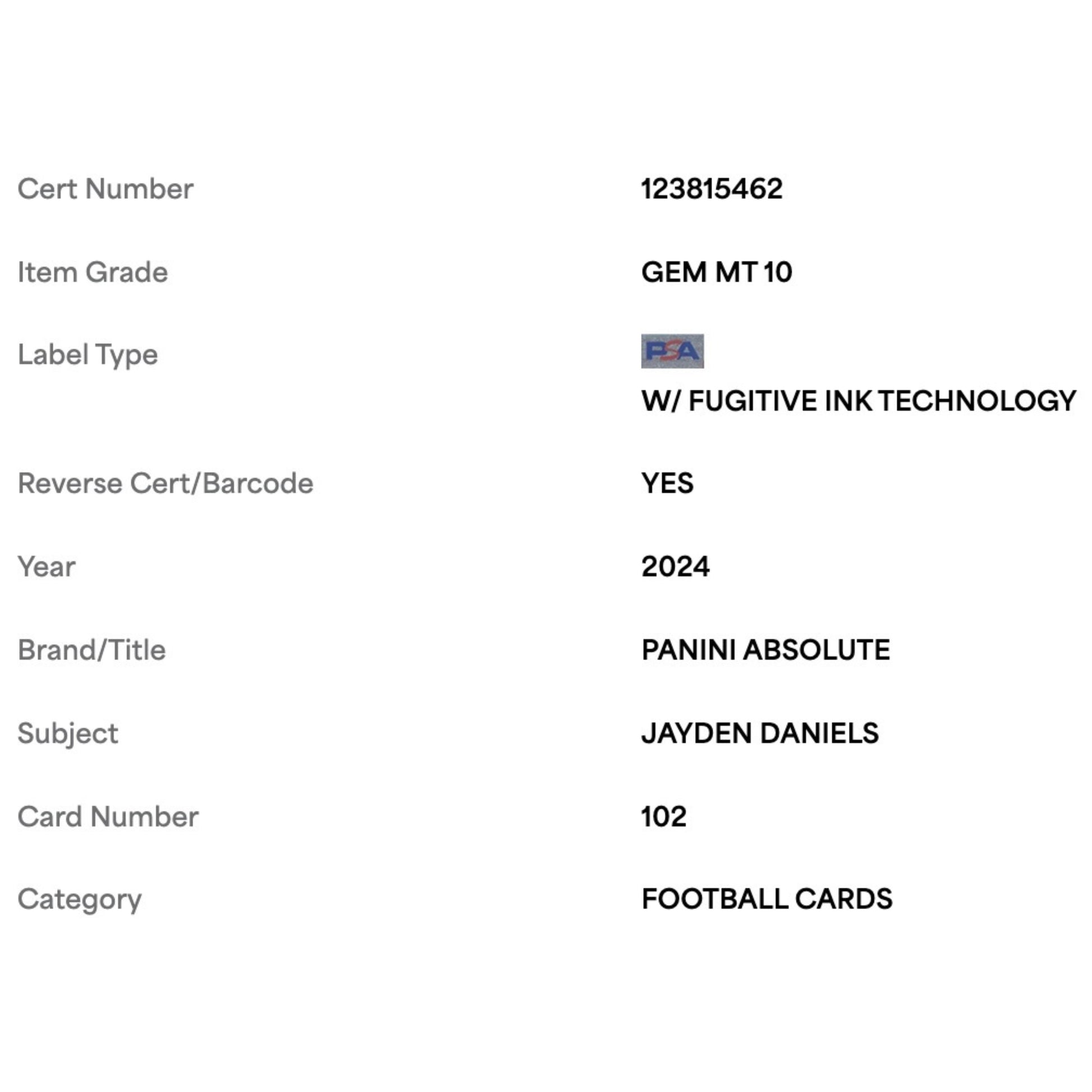 For avid football collectors and fans of Jayden Daniels this 2024 Panini Absolute Rookie RC Card #102 in PSA 10 is an absolute gem! This pristine piece is a must-have addition to any sports card collection.