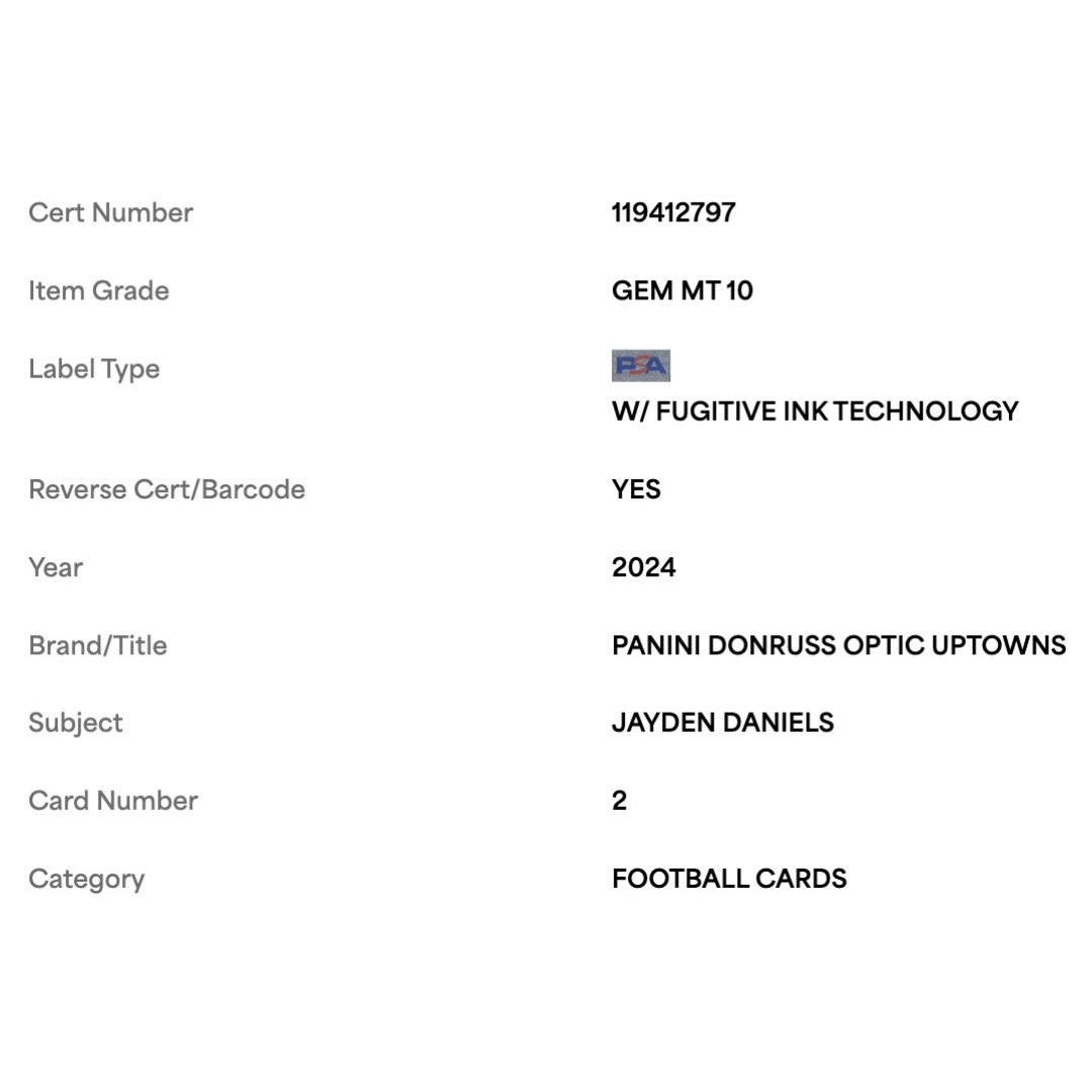 For avid football collectors and fans of Jayden Daniels this 2024 Panini Donruss Optic Uptowns Rookie RC Card #2 in PSA 10 condition is an absolute gem! This pristine piece is a must-have addition to any sports card collection.