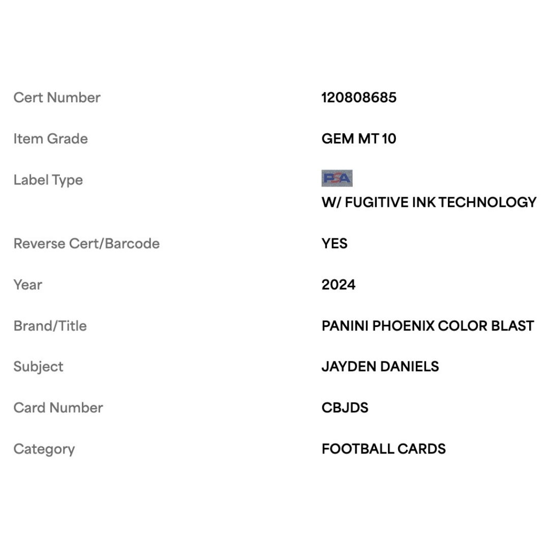 For avid football collectors and fans of Jayden Daniels this 2024 Panini Phoenix Color Blast Case Hit Card #CBJDS in PSA 10 condition is an absolute gem! This pristine piece is a must-have addition to any sports card collection.