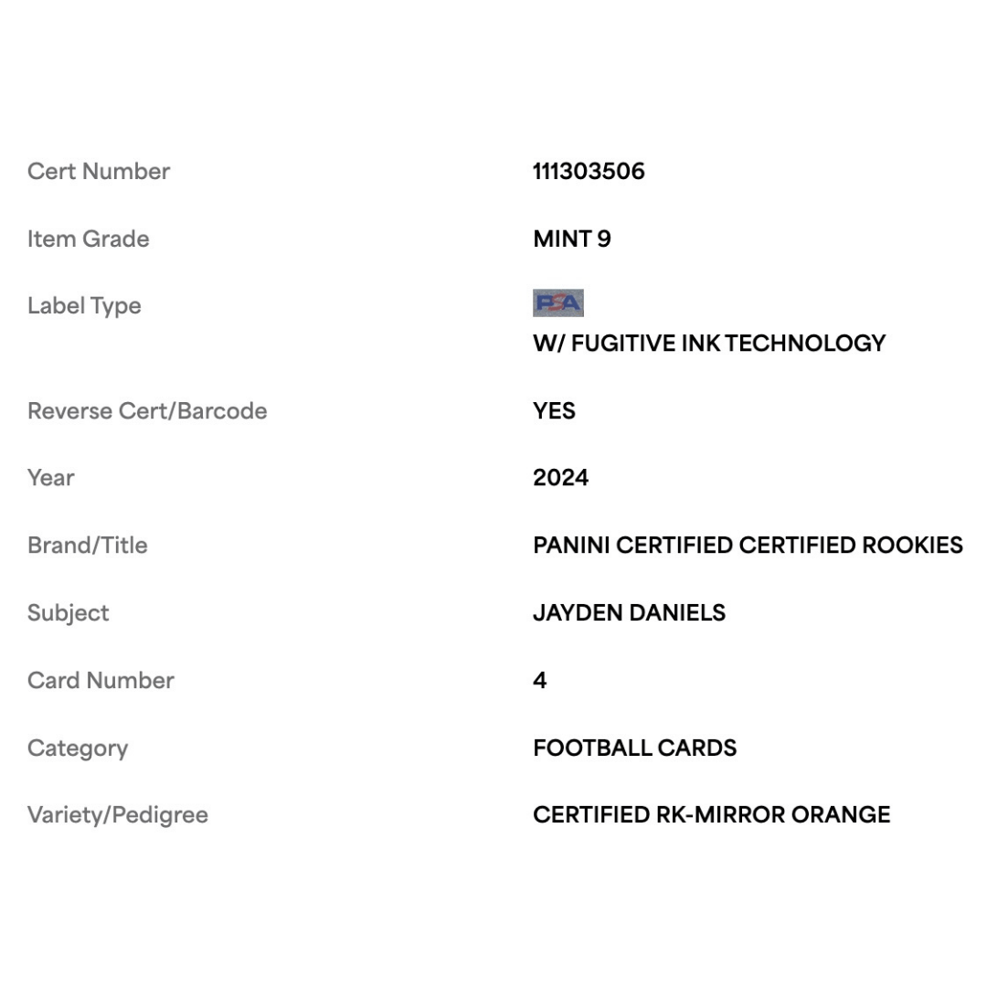 For avid football collectors and fans of Jayden Daniels this 2024 Panini Certified Rookies Mirror Orange #d/ 149 Card #4 in PSA 9 condition is an absolute gem! This pristine piece is a must-have addition to any sports card collection.