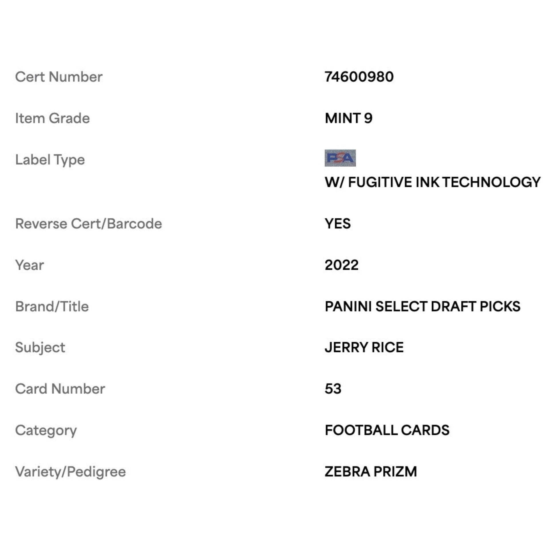 For avid football collectors and fans of Jerry Rice this 2022 Panini Select Draft Picks Zebra Prizm Case Hit Card #53 in PSA 9 is an absolute gem! This pristine piece is a must-have addition to any sports card collection.