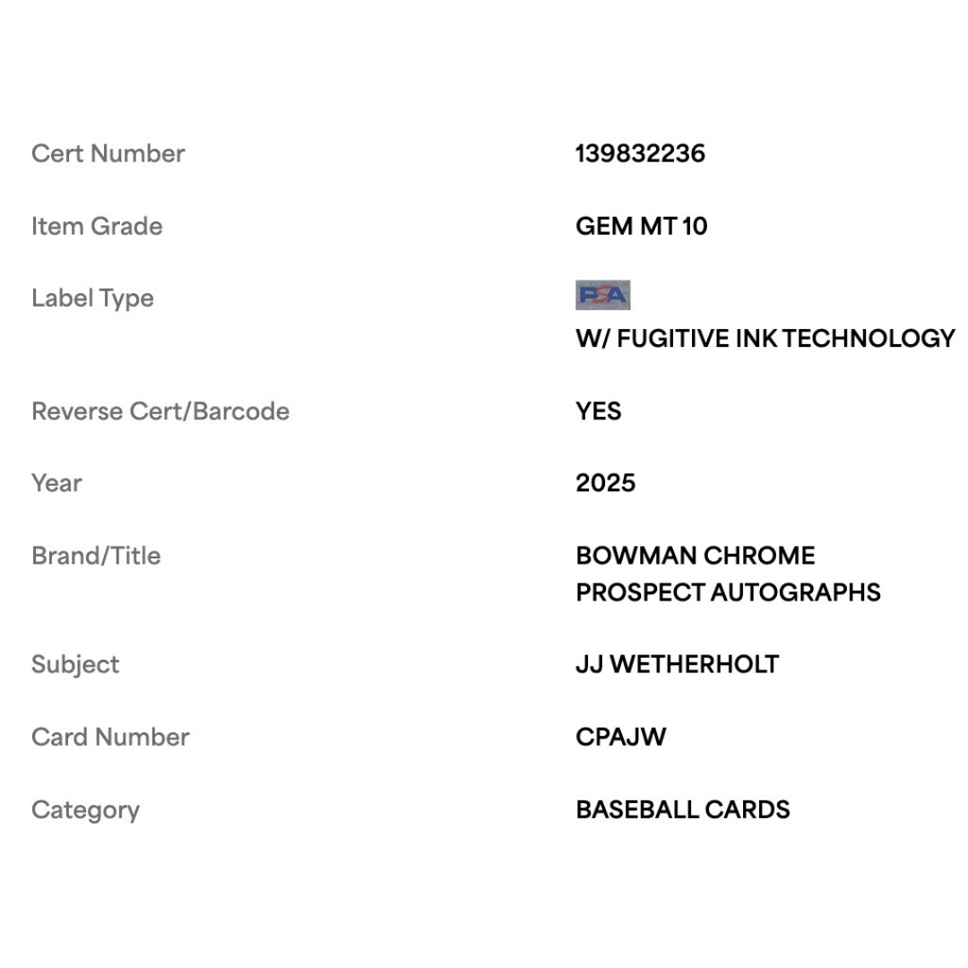 JJ Wetherholt PSA 10 2025 Topps Bowman Chrome Prospects Certified Autograph Series Card #CPAJW