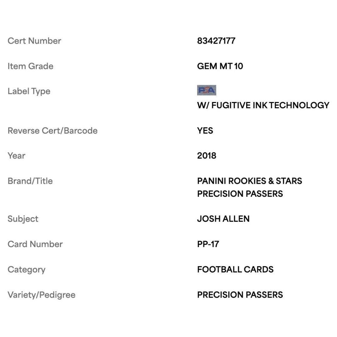 Josh Allen PSA 10 2018 Panini Rookies & Stars Precision Passers Card #PP17