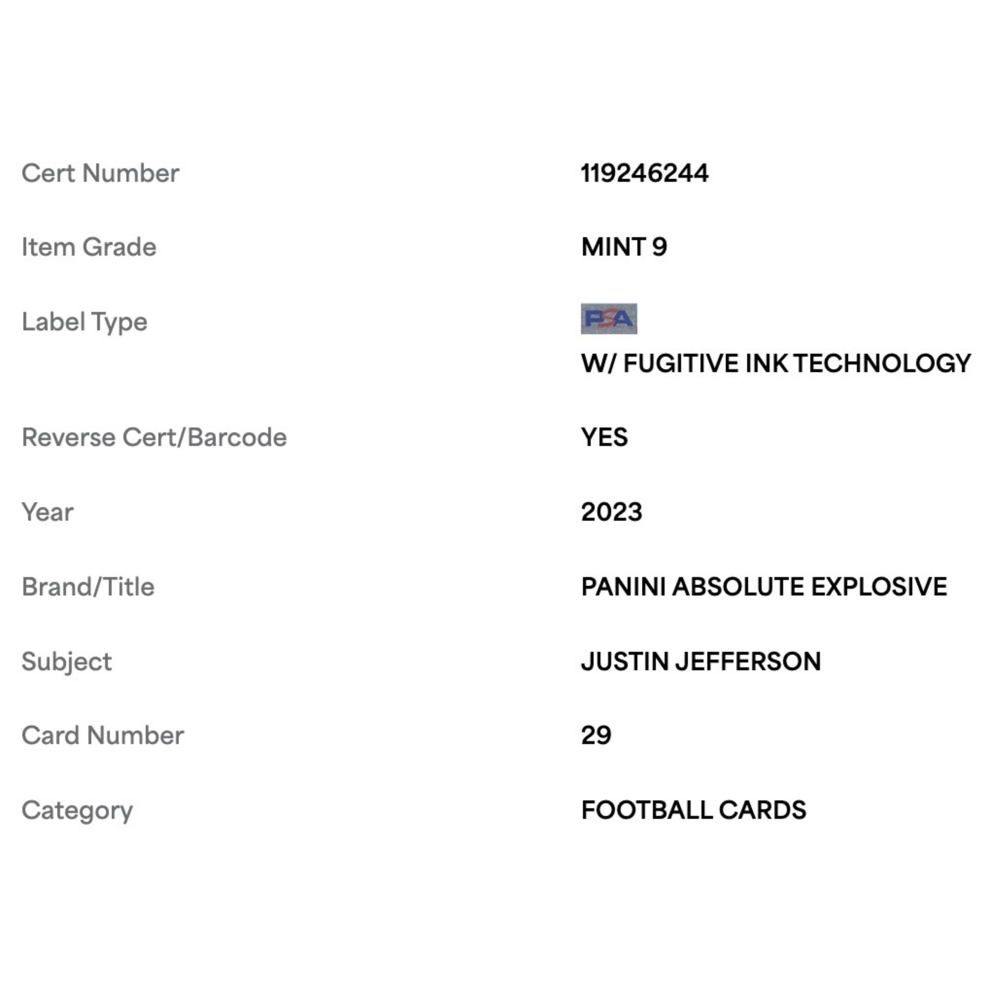 For avid football collectors and fans of Justin Jefferson this 2023 Panini Absolute Explosive Case Hit Card #29 in PSA 9 is an absolute gem! This pristine piece is a must-have addition to any sports card collection.