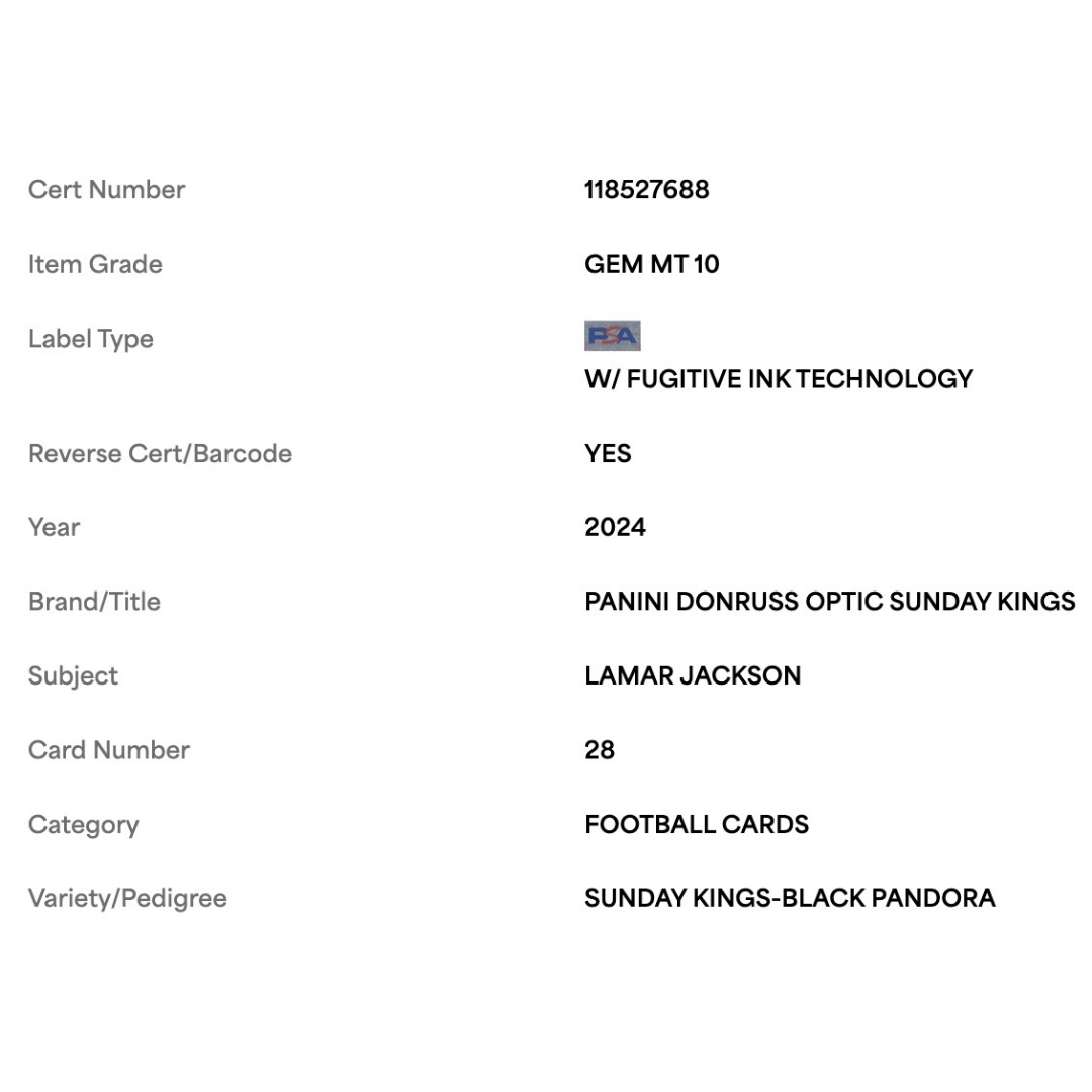 For avid football collectors and fans of Lamar Jackson this 2024 Panini Donruss Optic Sunday Kings Black Pandora #d/ 25 Card #28 in PSA 10 condition is an absolute gem! This pristine piece is a must-have addition to any sports card collection.