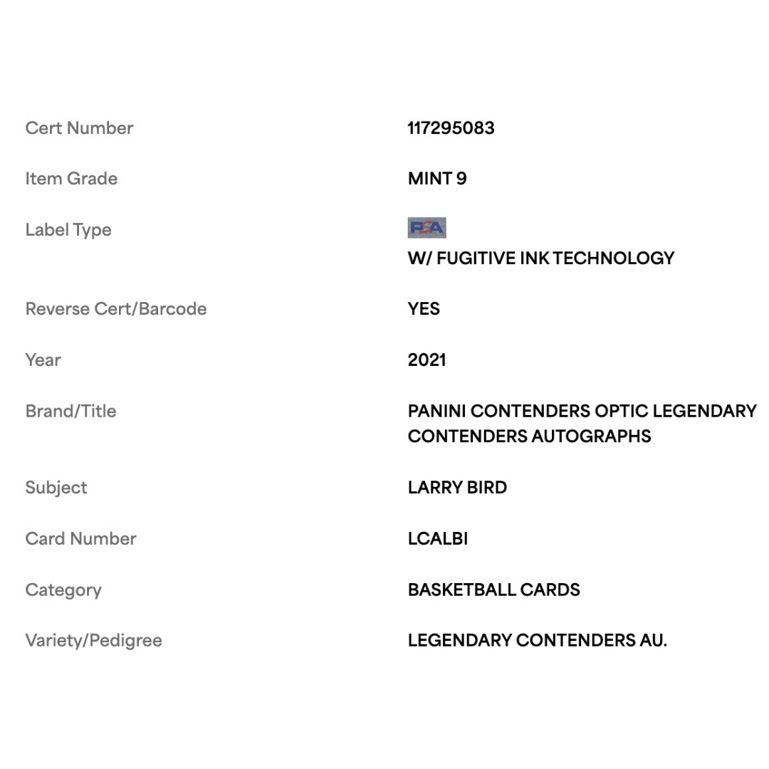 Larry Bird PSA 9 2021 Panini Contenders Optic Legendary Contenders Autograph #d/ 99 Card #LCALBI