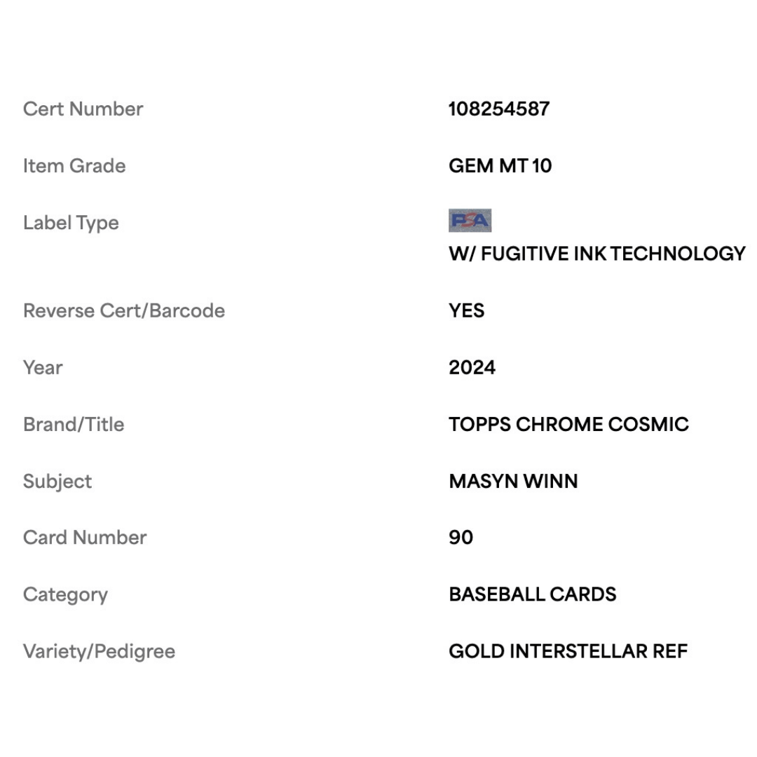 Masyn Winn PSA 10 2024 Topps Chrome Cosmic Gold Interstellar Refractor Rookie RC #d/ 50 Card #90