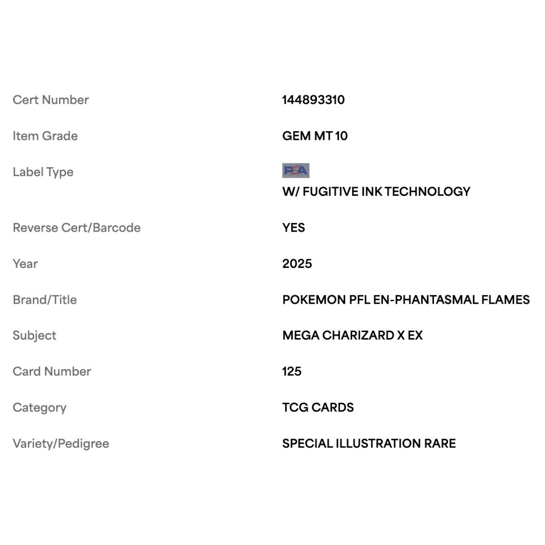 Mega Charizard X ex PSA 10 2025 Pokemon Phantasmal Flames Special Illustration Rare Card #125