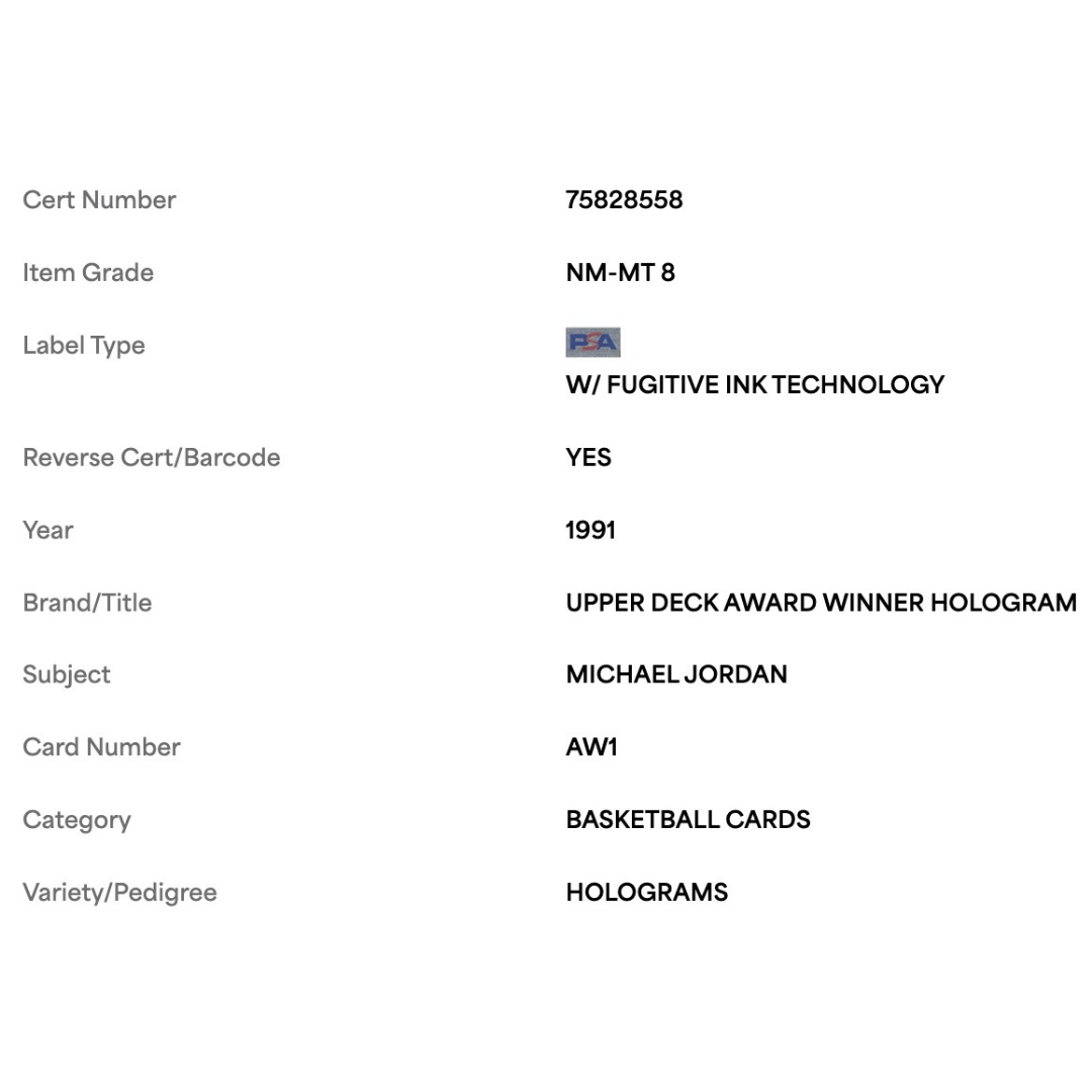 For avid basketball collectors and fans of Michael Jordan this 1991 Upper Deck Award Winner Holograms Card #AW1 in PSA 8 is an absolute gem! This pristine piece is a must-have addition to any sports card collection.