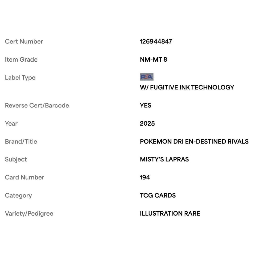 Misty's Lapras PSA 8 2025 Pokemon DRI EN Illustration Rare Card #194