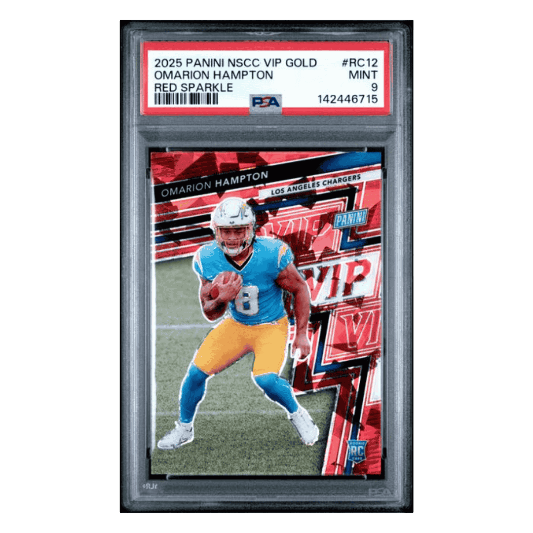 Omarion Hampton PSA 9 2025 Panini National Sports Collectors Convention VIP Gold Red Sparkle Rookie RC #d/ 99 Card #RC12