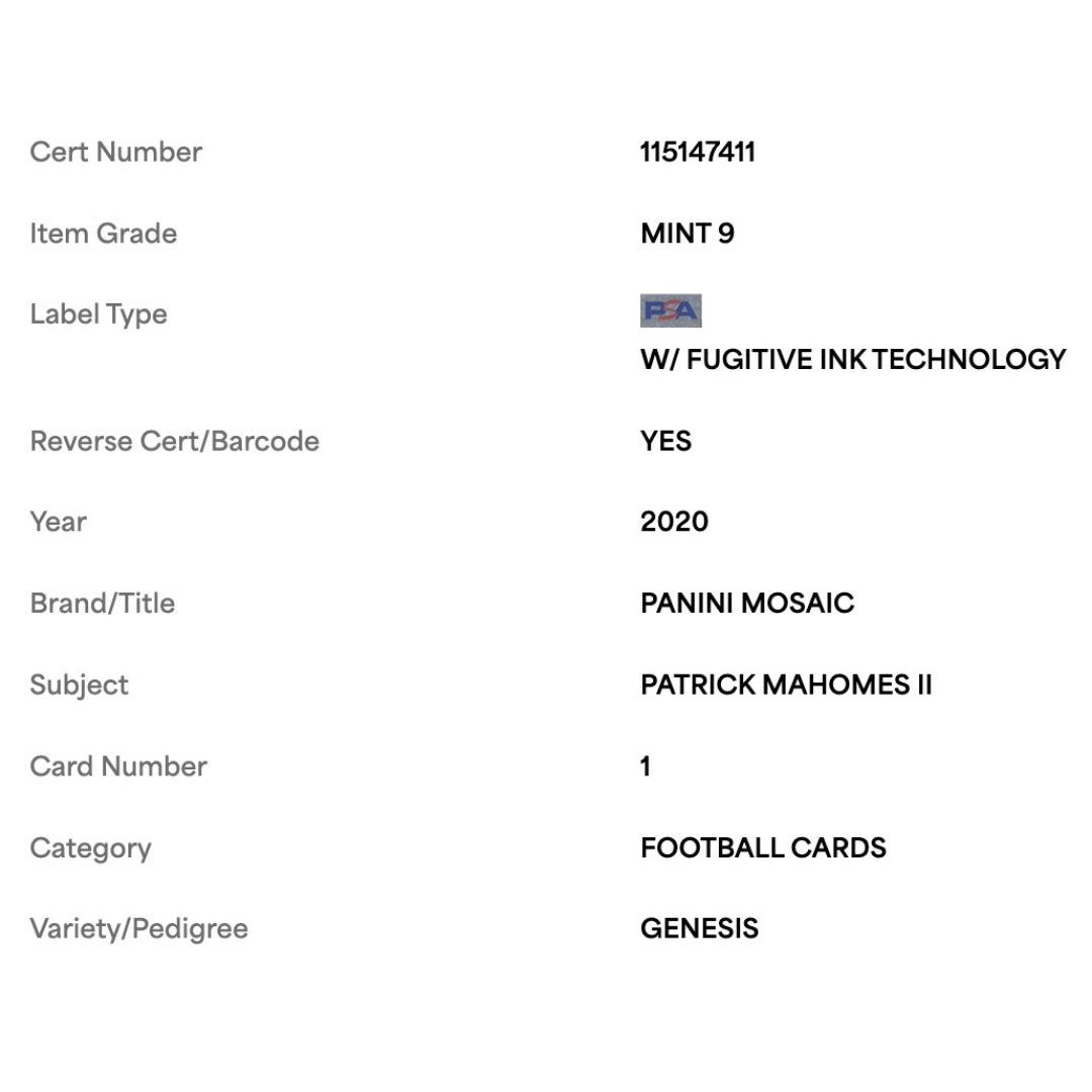 Patrick Mahomes PSA 9 2020 Panini Mosaic Genesis Case Hit Card #1