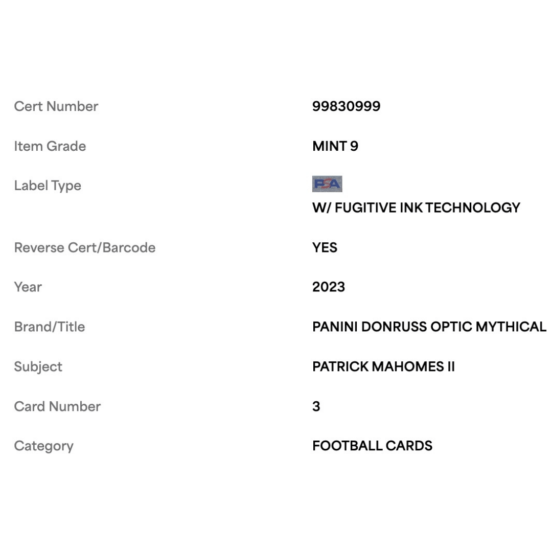 For avid football collectors and fans of Patrick Mahomes this 2023 Panini Donruss Optic Mythical Case Hit Card #3 in PSA 9 condition is an absolute gem! This pristine piece is a must-have addition to any sports card collection.
