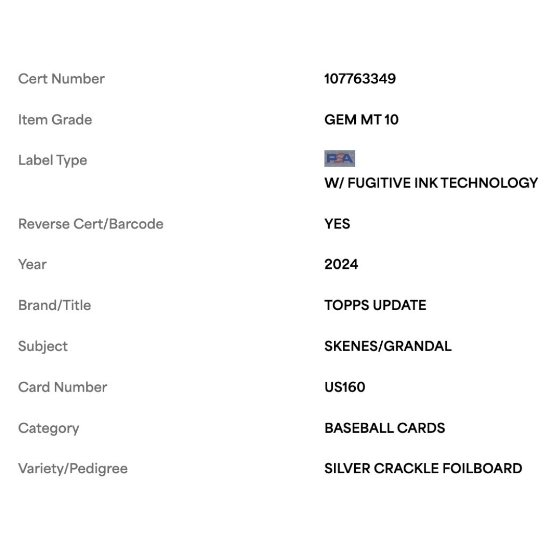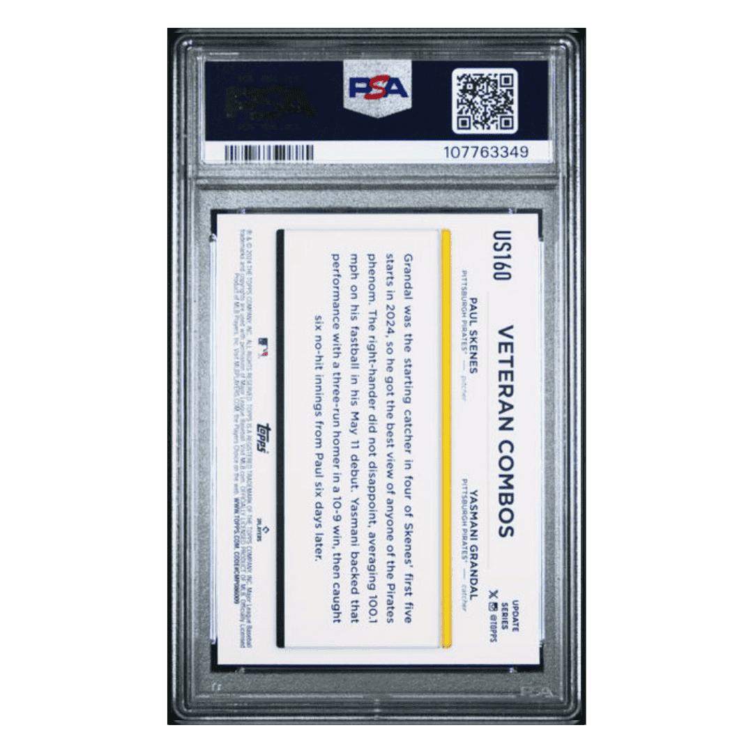 For avid baseball collectors and fans of Paul Skenes &/or Yasmani Grandal this 2024 Topps Update Silver Crackle Foil Board Card #US160 in PSA 10 condition is an absolute gem! This pristine piece is a must-have addition to any sports card collection.