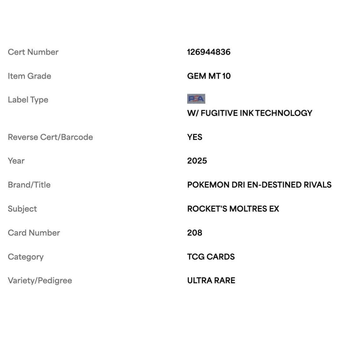 Rocket's Moltres ex PSA 10 2025 Pokemon DRI EN Ultra Rare Card #208