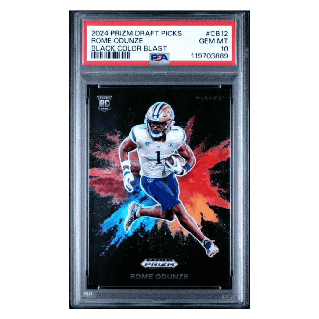 For avid football collectors and fans of Rome Odunze this 2024 Panini Prizm Draft Picks Black Color Blast Case Hit Rookie RC Card #CB12 in PSA 10 condition is an absolute gem! This pristine piece is a must-have addition to any sports card collection.