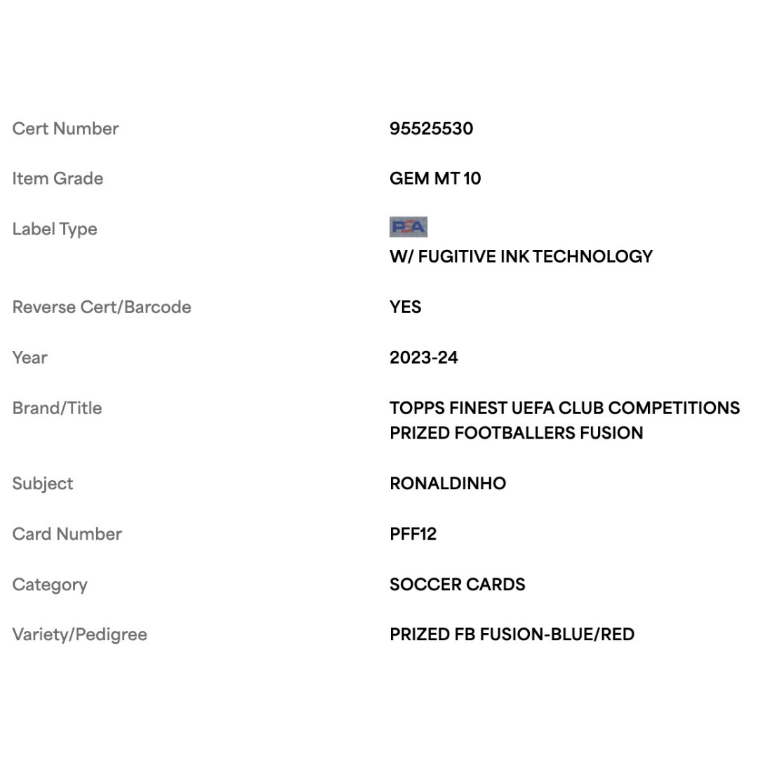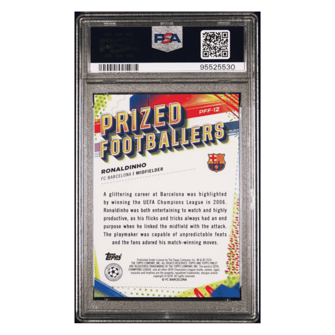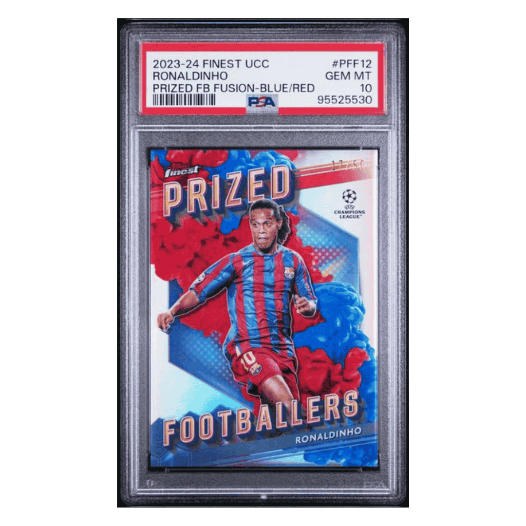 For avid soccer collectors and fans of Ronaldoinho this 2023-24 Topps Finest UEFA Club Competitions Prized Footballers Fusion Blue/ Red #d/ 50 Card #PFF12 in PSA 10 condition is an absolute gem! This pristine piece is a must-have addition to any sports card collection.