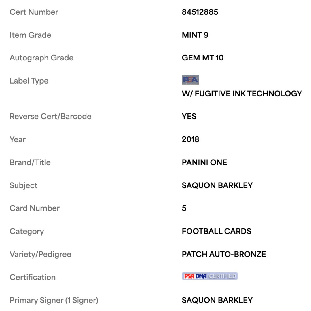 Saquon Barkley PSA 9 2018 Panini One Patch Autograph Bronze #49/ 49 Card #5