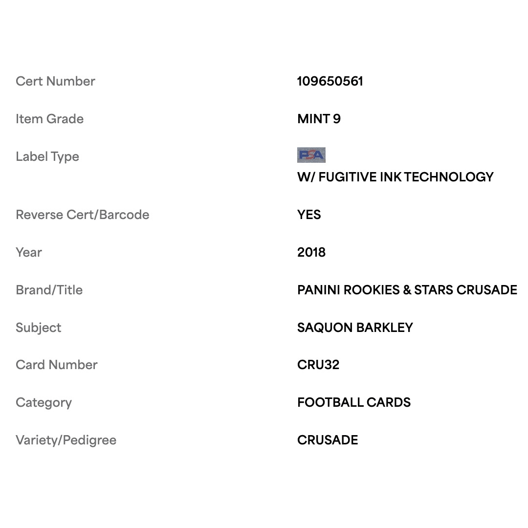 For avid football collectors and fans of Saquon Barkley this 2018 Panini Rookies & Stars Crusade Card #CRU32 in PSA 9 condition is an absolute gem! This pristine piece is a must-have addition to any sports card collection.
