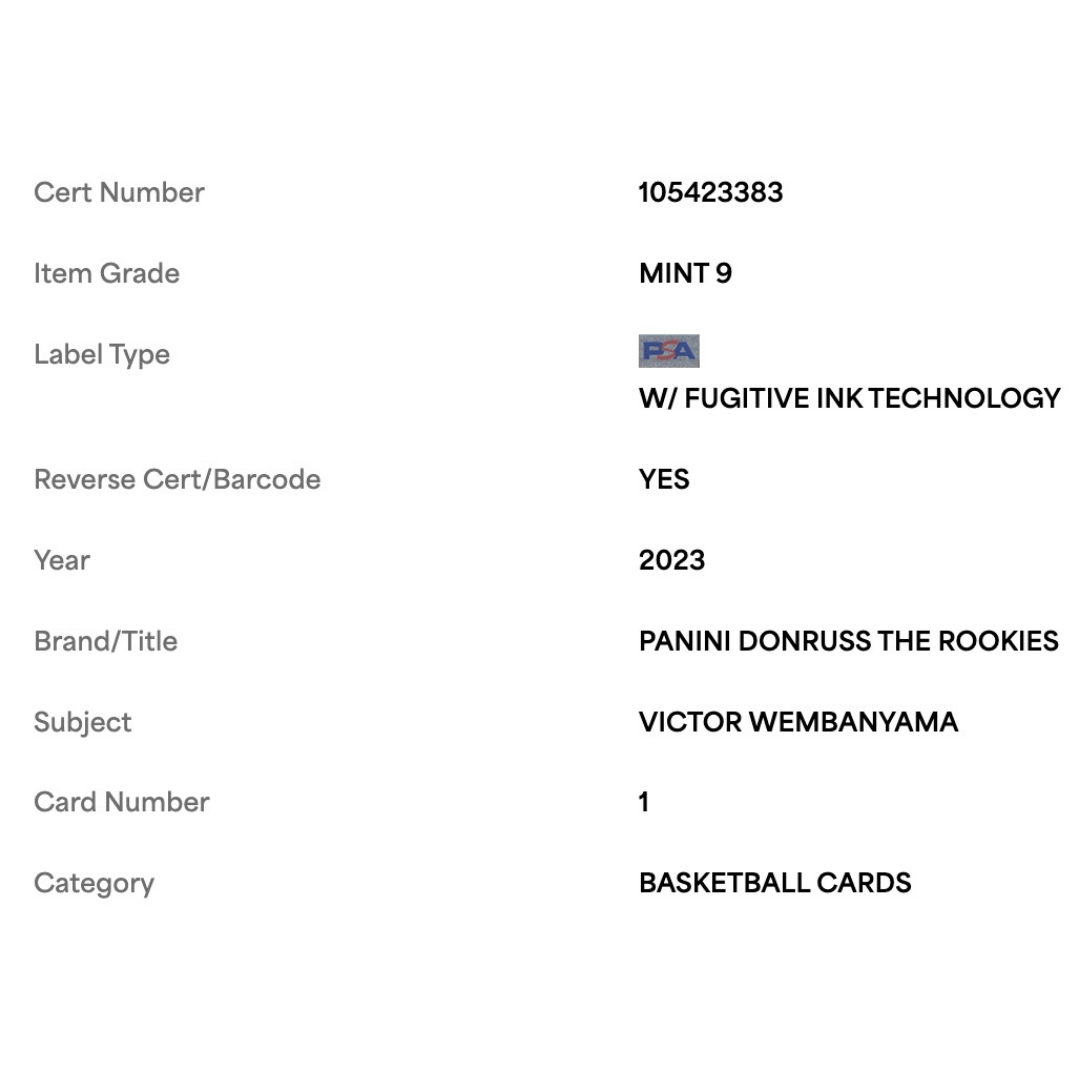 For avid basketball collectors and fans of Victor Wembanyama this 2023 Panini Donruss The Rookies Card #1 in PSA 9 is an absolute gem! This pristine piece is a must-have addition to any sports card collection.