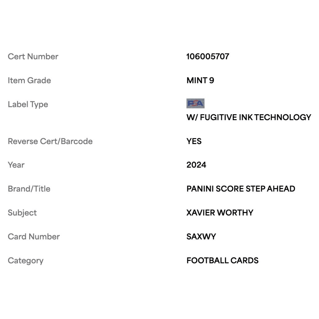 For avid football collectors and fans of Xavier Worthy this 2024 Panini Score Step Ahead Rookie RC Card #SAXWY in PSA 9 condition is an absolute gem! This pristine piece is a must-have addition to any sports card collection.